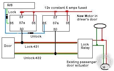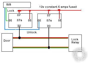 This is the wiring schematic. The switch in the LH door latch sends constant power to either the LOCK or UNLOCK input of the solid state relay which gives a pulse to either the lock circuit or unlock circuit. Simple enough but just dont know how to tie into that with this system so it doesnt backfeed into the relay and mess something up.