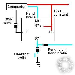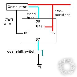 At rest the NSS (or ebrake) wire sees 12V+, thus disabling the RS. The black GWR wire changes the relay so that 30 is now connected to 87.