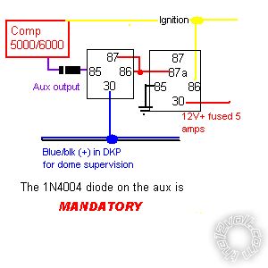 In the second diagram the left hand relay changes the aux wire polarity from NEG (-) to POS (+) and the right hand relay again shuts the dome light off with ignition.