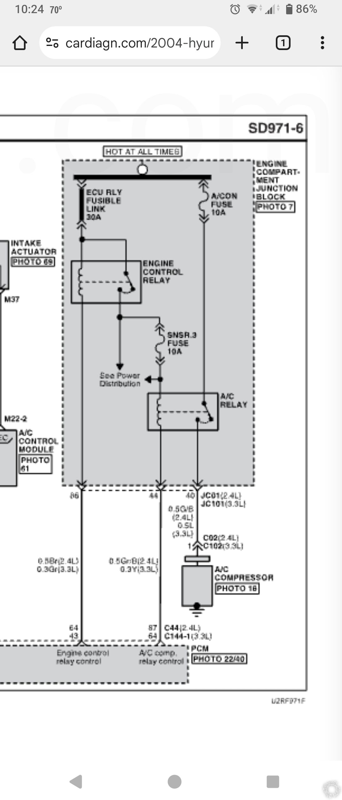 Wifey grumbled that the cabin air isn't cooling in her car. I found that the clutch isn't engaging when AC is activated. It does engages when I run a lead straight to 12v, so obviously the field coil is good. I plugged an OEMTOOLS 27211 into the AC relay socket in the power distribution box (engine compartment) and it indicates a short, according to the tool's literature, on the 86 lug, and I read ~6vdc-to-ground on this lug. The service manual isn't much help here.