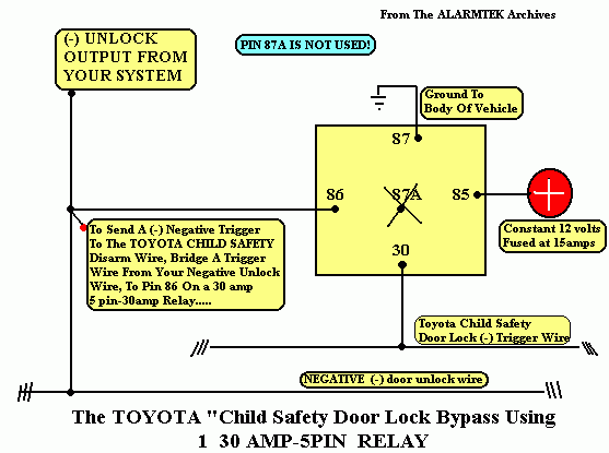 2. These so-called "child safety locks" are not so complex as they seem. All these diagrams with relays, diodes, and so forth are entirely unnecessary, and are a complete waste of time. Trust me, I do car alarm installs for three huge Toyota dealers, and I've researched the cars pretty thoroughly.