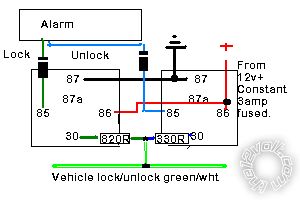 Thanks for that link...looks like that relay can be had at Best Buy for $10...I was afraid I was going to have to order it lol....and you say it already has the resistor soldered in? Is the wiring diagram for that somewhere on here or in the book? The book has one listed for reverse polarity locks, but it shows two relays. One on lock and one on unlock, but the wonderful page you sent me to only says to use it on The lock wire. The relay diagram says the relay uses +12v, green lock output wire(coming from alarm brain) and to cut the door lock motor wire and use that on 87a & 30, is that correct?