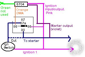 Green is equivalent to 87a. This should constantly connect to 30 unless the alarm is activated. Then the orange at 85 which is a constant ground at 85 and the pink which goes to 86 becomes activated via hot wiring the vehicle.