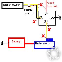 X marks testing points, work back from the starter motor.