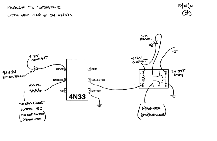 I built this circuit on a small piece of pc board and covered it in 1" shrink wrap. It is simply used to interface with the 5V reference voltage in my sunroof’s factory setup. For example, the reference lead to limit switch #3 reads +5V when the roof is fully closed and reads ground anywhere in the open position... therefore this circuit taps right into that lead. The relay activates when the roof is open and gives me an 'output' from pin13... in my setup this output is ground. I use this output to drive other relays to get what I want. Since I’m using an optoisolator the 2 circuits remain electrically isolated. The circuit consists of the following components: -Darlington optoisolator (4N33) -9.1V Zener diode -100 ohm resistor -12V DPDT relay -5mm LED (red) -fuse (not shown) The optoisolator is a simple integrated circuit that has an internal LED across pins 1 and 2. The low-current 5V reference from my vehicle is enough to light this LED. The other half of the 4N33 is a photosensor which detects when the internal LED is lit. Therefore the 4N33 is ideal for use in detecting when the 5V reference changes from +5V to ground or vice-versa. In my setup, the double-pole double-throw (DPDT) relay activates when my sunroof is in the open position (i.e. when the limit switch #3 lead goes from +5V to ground). I put an external LED on the second pole of the relay so I would know when the relay activates. This is obviously optional. If you don’t need this then a SPDT relay could be used. That’s all I have time for now. Have a great holiday!