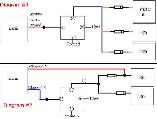 As for Diagram #2, just pay attention to "Channel 3", the one that's going to the relay. This is showing how to hook up a relay to the AUX channel from the alarm in order to make the alarm's negative output stronger....strong enough to use both 530ts.