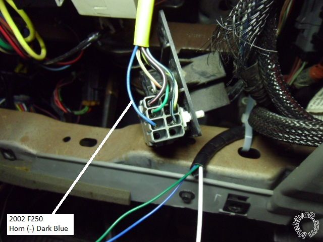 Here is a picture of the horn wire. Big warning! Ford has the bad habit of including the horn wire in the Yellow sleevedAir Bag Harness. Improper wire testing will deploy the air bag. Do not separate this connector and only test this wirewith a Digital Multi Meter.