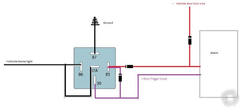 Connect 87 to ground, + trigger alarm input to 30 and 85 along with the negative lock output from alarm(using diodes as shown), Dome to 87a and 86.