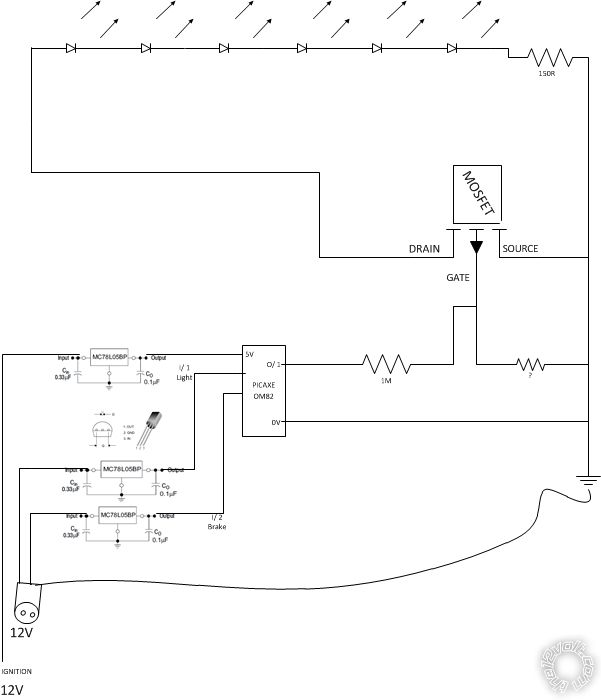[ Actually, the way I see it, a circuit diagram shows the electronic path and all components and switching etc. A wiring diagram is the "physical" depiction using "real" components etc - eg, the12volt's relay pics are wiring diagrams whereas I tend to post "circuit" diagrams. A schematic can be anything in between (as per many of the the12volt's "circuit" pics) or involve simplified or functional "blocks". Schematics are often simplified overviews to make the overall circuit's workings to be easier to understand. (So, if a circuit diagram has a block that replaces some components (eg, filter, or signal conditioning, or control circuit), is is a schematic?) ] Maybe I should review definitions, though I find the terminology people use is inconsistent, but each may be defined in each case (or company, or paper/article, etc). But it's usually trivial as readers - we usually see what a diagram conveys - or tries to convey! - without caring what its "diagrammatic type" is called. But one tip - before any test or exam, determine what the examiners mean... Why didn't I supply a wiring diagram when they asked for a circuit diagram? (Answer - because they asked for a wiring diagram and I was unaware of their definition - not that they had one! $%#@##!!) Ooops - I digressed. The underlying point - don't get too confused or hung up on ay issue. "Accept" and file it away for now and later it may (and probably will) fall in place. And always be open to new or alternative interpretations (even your own established "facts" or methods). We are clever enough to adapt, and others are clever enough to have better or alternate and still valid solutions. Oh the pain! (LOL!) Back to your diagram... The "input" fed off the LED supply. Shouldn't that be from the brake or tail signal? If so, or could be combined into the other input's resistive divider - ie, 3 resistors. As to resistor values, I'll look at that later. We want to determine 4 states - both off (easy - 0V), tail on, brake on, and both on. Note that for each, we program in a tolerance, eg, 0V is <0.5V, 3V = (say) 2.6V to 3.4V etc. Also no capacitors in series with the voltage regulator (caps do not pass DC, hence no current with flow). They go "across" the supply, ie, between +ve and GND. That's to smoothen the voltage (by "shunting" or conducting the noise (AC) to GND). FYI - find some good "water models" for electricity. A capacitor is like a a pipe pouring into a bucket with its outlet part way up the side. Once filled above the outlet, the varying water inlet is "smoothed" out at the output. BTW - don't take water models nor any model to the extreme. They are merely models chosen to explain certain behavior thru analogy. They do not apply universally - ie, water is not electricity and a bucket is not a cap, but that bucket model is good to picture "capacitor smoothing" in principle. Too many people take the model to be the real "target" thing. Eg - if you use the atom as a solar system model, you can be in big trouble for certain theories etc. And models change. Eg - light. Once modelled as particles (eg, ping pong balls). Later modelled as waves. Now modeled as "photons" - a "particle" that exhibits "wave-like" properties. [Ain't that interesting? Do we model electro-magnetism as photons? Light is part of the electro-magnetic band. And if you really want to fuse (bad pun) your mind - what is electricity?; what is its fundumental unit? - it must exist, WE know that! PS - I suggest you might "take this onboard", but DO NOT ponder hard on it - maybe ask the experts and see how they also squirm!] Oh dear, lots of digression... [ My [bracketed] and FYI and BTW etc test tends to be extra info. ] But apart from series capacitors and that 2nd input, - oh, and a GND for the 78L05 - your circuit, er, schem... er, diagram looks fine. (IMO it's a circuit diagram.) Input resistance values later, though the others like 150R series LED resistors, and the MOSFET resistors look fine. Well done! Posted By: corrollaman Date Posted: August 08, 2012 at 10:15 PM Well, still waiting on parts... I see exactly what your talking about for the capacitors.. Thank You.. that would have really rained on my parade..