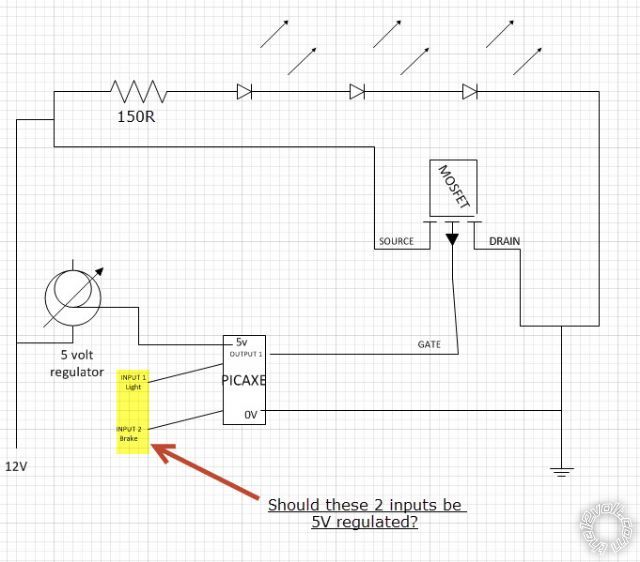 If you look at this link, https://petemills.blogspot.ca/2012/04/tenty-led-brake-lights.html, I would like a pulse of brake light that is similar to Peters. I believe it's legal to do up to three pulses without being classified as a flasher, which is illegal in the states.(and not someone in a trench coat, kind of flasher) I'm on board with the PICAXE idea.. being green behind the ears, but enjoying the hell out of learning about electronics makes that suggestion an easy Yes. I read through Peters entire guide/setup and when i did further research i was going to have to buy a software application and some kind of PIC programmer etc.. (wasn't too keen on the idea of spending even more money) I gather from what you describe it wouldn't take much to get the PICAXE, the software is free, and from what I read on that Ch. 3 all i need is a serial cable, which i have some at the office. I wasn't sure what a MOSFET was.. but after I googled it.. its a transistor.. so now all I need to do is figure out how all this comes together. More research.. :-D So far I am already on board with doing 48 LED's in a an array of 3 per string.(based off of a LED array calculator) I have checked the voltage from where I am getting power and it sits around 13.2-14.4 depending on if i am really giving it the gas.. I am wondering if I should put a voltage regulator on it or not.. and what voltage would i use for my calculations. I am thinking when this is all put together I may have to adjust my Resistance a few times so as not to blind the people behind me.. hehe I have also wondered about using a capacitor and a voltage regulator.. keeping in mind that I want this perfect so I don't destroy the leds and they outlast me. Okay I am done rambling on and on.... Once I have enough information, and sleep. hehe I will put together a drawing of all this.... my dreams have been full of leds.. hehe (LEDS: Red 8mm .5 watt 3.4-3.6V, 20mA Vf, 100Kmcd) ------------- AJM Posted By: oldspark Date Posted: July 23, 2012 at 11:59 PM Phew - "a little extreme for a picaxe" and then you link to an ATtiny!