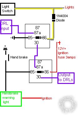 thank you sir for that clarification, i already looked at my car's diagram and its a GREEN/ red cable. but before i do any complicated wiring, i just finished the basic one and i ran into something odd - the drl works when i turn on my park lights instead of vice-versa. is there too much power from the lights? not enough power from IGN? are the relays (i already tried two of them with the same result) damaged? i also put a diode but 1N4148 'cause i cannot find the one on your diagram i.e., 1N4004 - is that the problem? please help. sorry again for bothering you. ------------- Noob Forever ....